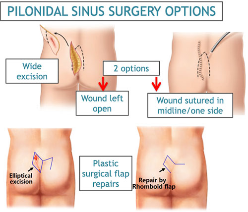 A pilonidal sinus is a small hole or tunnel in the skin, typically at the top of the buttocks (near the coccyx), that can become infected and filled with pus, forming a pilonidal abscess. It’s a common condition, especially in young adults, and is more frequent in males. 🔍 Causes The exact cause isn’t fully understood, but contributing factors include: Ingrown hairs: Loose hairs penetrate the skin, causing inflammation Friction or prolonged sitting Poor hygiene Excess body hair and sweating Genetic predisposition (deep natal cleft) ⚠️ Symptoms Pain and swelling near the top of the buttocks Redness and tenderness in the area Pus or bloody discharge from a small opening (sinus tract) Foul-smelling drainage Fever (if infected/abscess forms) 🔬 Diagnosis Based on physical examination A visible midline pit or opening in the sacrococcygeal area May have multiple tracts or openings if chronic 💉 Treatment Options 1. Acute Abscess Incision and drainage (I&D): Immediate relief Often performed under local anesthesia Wound may be packed and left to heal by secondary intention 2. Chronic or Recurrent Pilonidal Sinus Surgical excision of sinus tracts Options include: Wide excision with open healing (low recurrence, longer healing) Excision with primary closure (faster healing, higher recurrence) Flap procedures (e.g., Limberg flap, Karydakis flap) for recurrent or complex cases 3. Minimally Invasive Techniques Phenol injection, laser treatment, or endoscopic pilonidal sinus treatment (EPSiT) Less invasive, faster recovery Lower recurrence in selected patients 🩺 Postoperative Care Keep the area clean and dry Shaving or laser hair removal to reduce recurrence Avoid prolonged sitting during recovery Regular follow-up to monitor healing ⚠️ Complications Recurrent infection or sinus formation Chronic wound Scar formation Cellulitis or spreading infection (rare)